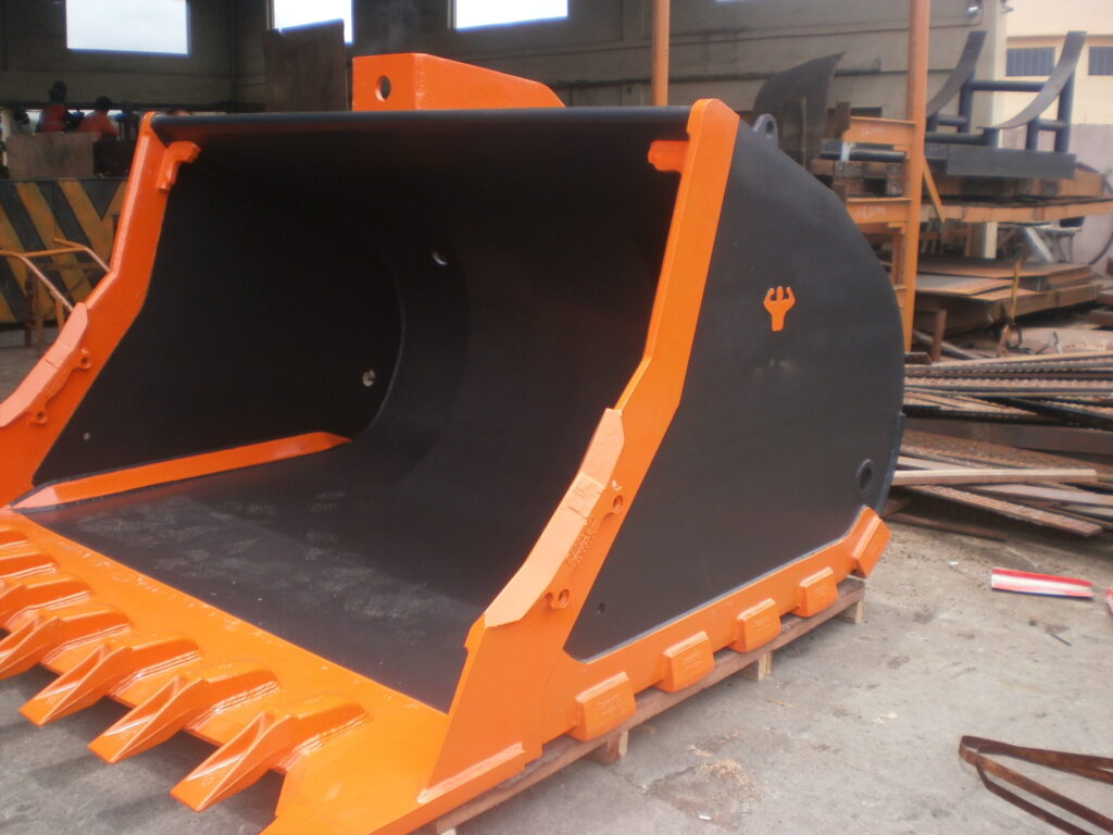 Loading bucket for extra heavy duty work. For use with the heaviest working conditions on rocky and extremely abrasive surfaces. Completely manufactured in special wear resistant steel. Designed with a penetrating profile, it features a wide wear resistant accessories such as delta and semi delta blades, rock teeth, interdental shrouds, internal and external heels, reinforced sides, side protectors etc. which add longevity under extreme working conditions.